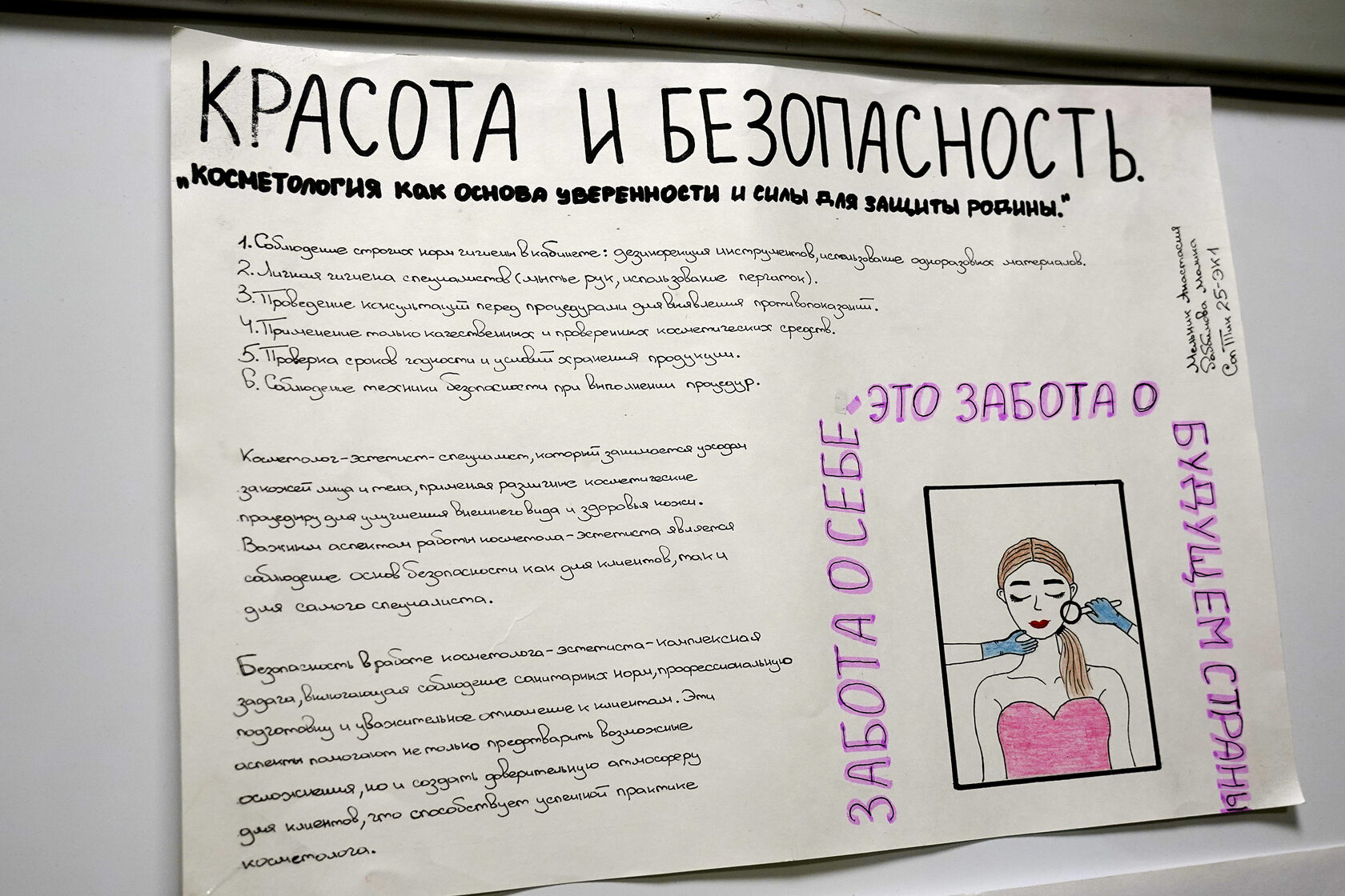 Впечатлила оригинальность, с которой студенты Профессионалитета провели параллели между своими профессиями и Днем народного единства. Яркий пример — осмысление «Эстетической косметологии» как работы не только с внешностью, но и с национальным самосознанием. Через метафору красоты и здоровья студенты показали, что уверенный в себе народ, заботящийся о своем «лице» — это и есть истинная сила и защита Отечества, залог его светлого будущего.